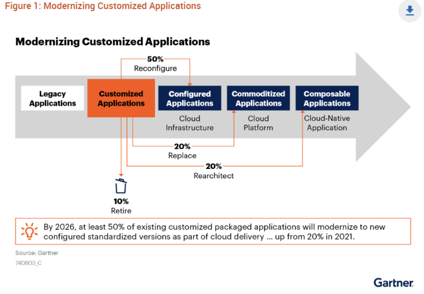 We need a common ground to enable custom code without impacting future migration and upgrades. Gartner recommends composable applications (aka Low/No-Code platforms) to overcome the hurdles.