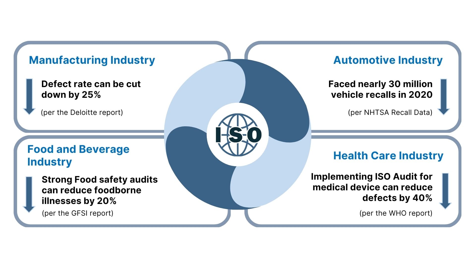These audit solutions are critical across various industries like Manufacturing to ensure Quality Control, Automotive Industry to ensure Safety and Compliance, Food and Beverages to ensure Food safety, Construction to ensure various safety standards and many such areas to drive efficiency and reliability end to end. In the Manufacturing industry by implementing effective Audit solutions the product defect rate can be cut down by 25% (per the Deloitte report). The Automotive industry, that faced nearly 30 million vehicle recalls in 2020 alone (per NHTSA Recall Data) shows how crucial audits are for preventing safety issues. Similarly, In the food and beverage sector, strong food safety audits can reduce foodborne illnesses by 20% (per GFSI report). These statistics prove the need to adopt ISO audit solutions to maintain high standards and prevent costly errors across different industries.Â